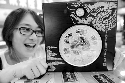 8月26日,一位顾客在北京工美大厦展示“日晷”银章。 当日,一款由8盎司纯银打造的“日晷”银章在北京亮相。这款银章以我国古代的计时仪器“日晷”为设计原型,银章正面记录了开国大典、改革开放、港澳回归、飞天梦圆、北京奥运、新中国60华诞等重大事件。 新华社发