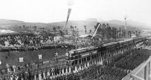 1964年8月,成昆铁路开始施工。修路工程十分艰巨,全线要修427座隧道,很多隧道塌方成山,流水成河,施工十分困难。工人们用空中索道,从波涛滚滚的金沙江上运送修路器材。全线还有653座桥梁,一线天石拱桥,跨度54米;三线桥,一座桥上架3条铁路线;大渡河桥,最大的一孔跨度长达140米;金沙江大桥,钢梁一孔长192米,是我国目前跨度最大的桥梁。图为成昆铁路通车典礼盛况。