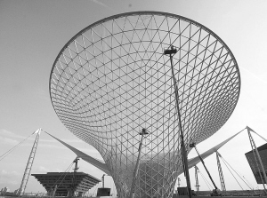 主体结构完工的上海世博轴阳光谷与远处的中国馆遥相呼应(9月13日拍摄)。2010年上海世博会永久性标志建筑之一——上海世博轴的主体结构当天完工。世博轴位于上海世博园区的主要入口处,是园区内规模最大的单体建筑。世博轴分为地上、地下两层,上层设计了一个巨型的膜结构,看起来就像是荡漾的湖水。而世博轴上最引人注目的是晶莹剔透的、喇叭状的装置——“阳光谷”。它独特的形态使得阳光和空气可以自然倾泻入室,减少人工照明的能耗,并能有效提升空气质量。同时,雨水也能在这里被收集并二次利用。 新华社发