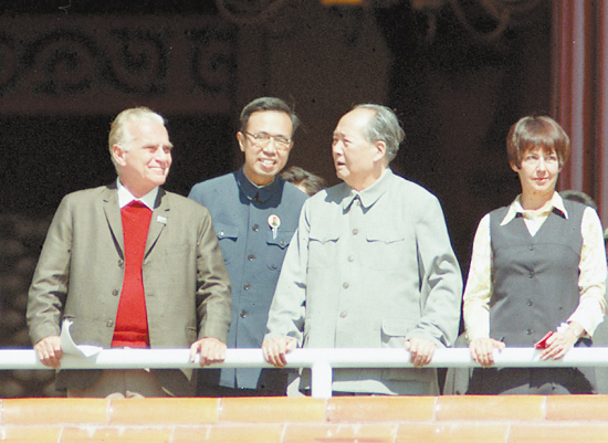 1970年10月1日,毛泽东和斯诺及夫人在天安门城楼上。同年12月,在和斯诺的谈话中,毛泽东表示欢迎美国总统尼克松访问中国,改善中美两国关系。 新华社记者 齐铁砚 摄