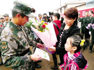 10月8日,参加国庆60周年阅兵的张元通与妻女团聚。当日,驻洛阳某部——被誉为“铁军”的两个装备方队的360名官兵圆满完成国庆60周年阅兵任务回到驻地,受到热烈欢迎。新华社发