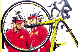 10月9日,自行车爱好者在展览会上参观高级赛车。当日,近百辆世界著名运动自行车品牌的顶级自行车汇聚杭州,在2009第30届中国浙江国际自行车电动车展览会上集中亮相。新华社发