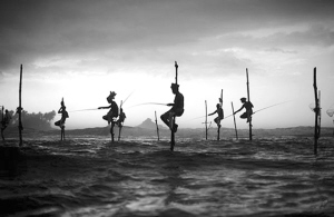 10月8日,在斯里兰卡南部的阿杭格默,当地渔民坐在类似于高跷的竹竿上垂钓。“高跷垂钓”是当地渔民传统的捕鱼方法,每只竹竿都是家族世代相传的财产。