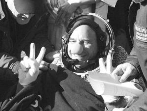 10月11日,加拿大太空游客盖·拉利伯特乘俄“联盟TMA-14”载人飞船返回地面后向人们致意。他与俄宇航员根纳季·帕达尔卡和美国宇航员迈克尔·巴拉特于11日莫斯科时间8时32分(北京时间12时32分)降落在哈萨克斯坦阿尔卡雷克市北边的草原上。据悉,拉利伯特是加拿大一位亿万富翁,他是上月30日乘坐俄“联盟TMA-16”载人飞船飞往国际空间站的。新华社发