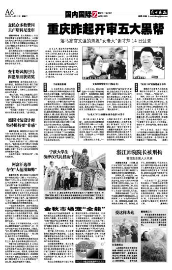 12日上午,重庆市开始审理涉黑系列案件。重庆市的打黑除恶专项行动从今年6月开始,截至8月15日已控制黑恶团伙嫌疑人1544名。14个涉黑涉恶团伙受到重创。从12日起到10月19 日,杨天庆、刘钟永、谢才萍、李义、张波五大黑恶团伙的首犯、喽啰以及保护伞将在重庆5个中级法院逐一接受公审。这次集中审判,吸引了全国关注的目光,有媒体将它称作:“重庆大审判”。其中,最受瞩目的当属14日过堂的“女老大”谢才萍。