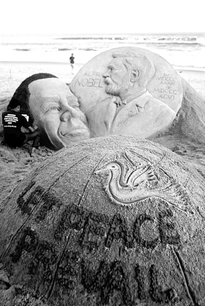印度沙雕艺术家帕特内科10日在临近布巴内斯瓦尔的沙滩上,为祝贺奥巴马获得诺贝尔和平奖进行沙雕作品创作。新华社发