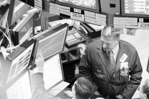 10月14日,交易员在美国纽约证券交易所内工作。受英特尔和摩根大通业绩超预期的推动,14日纽约股市道琼斯指数盘中上破万点大关,这是2008年10月以来,该指数首度重上万点关口。新华社发