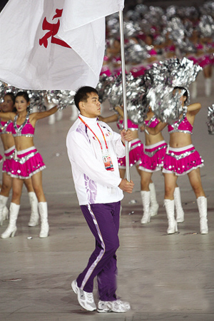 据观察,各代表团旗手多由运动成绩突出、长相俊朗的青年选手担任,如北京代表团的张怡宁、上海代表队的王励勤、广东代表队的朱芳雨等等。看来,成绩骄人的张志磊也已成了河南体育的“形象代言人”。