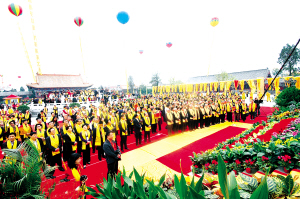 昨天上午,古城鹿邑被装点得赏心悦目,面貌一新,明道宫前的弘道苑广场上,花香四溢,人海人潮,巨龙腾飞,锣鼓震天,道旗飘展,一派欢庆气氛。古朴庄重的牌坊,水花四射的音乐喷泉,气势恢弘的玄元殿,在苍松翠柏的掩映下,显得更加肃穆庄严。