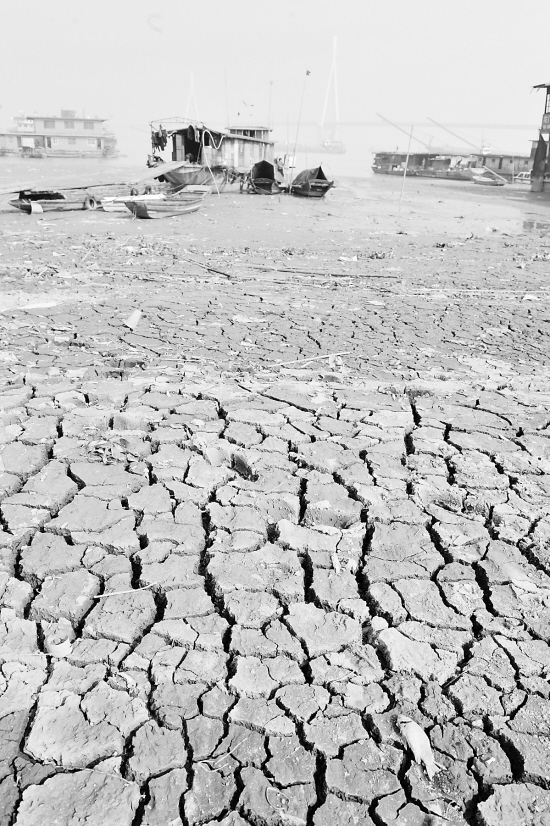洞庭湖畔的岳阳渔港码头干涸的湖床(10月17日摄)。10月17日14时,洞庭湖城陵矶水位跌至21.72米,远低于近几年同期水位。历史罕见低水位造成渔民歇业、航运受阻等系列连锁反应。近段时间以来,受洞庭湖区降水较少,湘、资、沅、澧四水来水减少,长江三峡拦坝蓄水等共同影响,洞庭湖水位一直低于往年同期。低水位造成大部分渔民只能歇在家中,靠平时积蓄度日,低水位