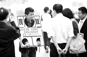 本报综合消息 18日下午6时左右,一个头戴枷锁、手扣锁链的青年男子出现在成都春熙路北口,枷锁上还写了“房奴”两个大字和若干小字,引起路人围观。据该男子解释,此举是想引人注意转让自己的商标权,以换钱还房贷。