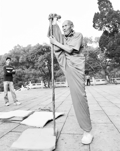 蛤蟆功 苦练27年 九旬老人轻松“朝天蹬” 本报综合消息 19日清晨,91岁的肖清连老人在武汉施洋烈士公园内表演“功夫”,吸引了不少晨练者驻足观看。 肖爹爹先做了个准备运动“朝天蹬”,只见他将右腿抬起轻松举过头顶,后脚跟超过头顶10余厘米。肖爹爹称“朝天蹬”是基本功,吃不了这苦,就练不了蛤蟆功。 1982年离休后,身体每况愈下的肖爹爹便开始锻