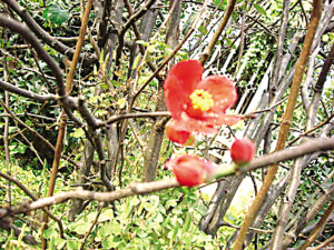 昨日记者看到,这株海棠位于该县财政局花园一角,树叶大部分脱落,枝上有一些红色花朵已经盛开,其余的则刚露出黄色花蕊,几名摄影爱好者拿着相机围着海棠花争相拍摄。