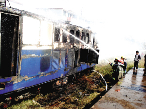 近日,太康县火车站一火车头着火,情况十分危急,太康县消防大队官兵立即赶赴现场用水枪实施扑救,并为油箱降温防止爆炸(左图)。经过20分钟战斗,消防官兵终于成功将大火扑灭。晚报记者 张洪涛 摄