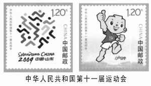 2009年10月16日,第十一届全国运动会在山东济南举行。国家邮政局于10月11日发行一套两枚《中华人民共和国第十一届运动会》纪念邮票,图案为“会徽”和“吉祥物”,同时发行此套邮票的小全张。