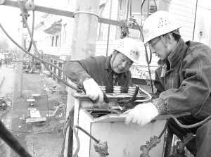 太康县电业局组织30名施工人员,从11月6日起,对该县县城东街、坊子街等8条老城区街道的高低压线路进行全面改造,以确保居民冬季生活用电安全可靠。图为施工人员正在架设10千伏线路。