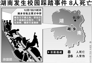 调皮男生堵楼梯口,导致恶性踩踏事故。这一惨剧发生在湖南湘乡育才中学。7日晚9时许晚自习下课之际,学生们在下楼梯的过程中骤然引发拥挤,造成8人死亡、26人受伤。截至8日11时,受伤住院的26人中已有3人出院,其余伤者伤情稳定。8日,记者从湘乡有关部门获悉,湘乡市教育局党委副书记、局长朱清华已被免职,校长被拘留。