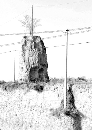 这3根电线杆,分别矗立在不同高度的土层上,其中最高的那根被当地群众称为“最牛的电线杆”,它的位置是当时地面表层(12月4日摄)。前几年,在河南省孟津县境内的岗坡地上,建有多座黏土砖窑场,窑厂就地取土烧砖,造成大片耕地被毁坏,土地资源流失状况严重。据当地群众反映,1年多前,这些窑场全部被依法拆除,占用的土地恢复了农田耕地和大棚蔬菜的种植。矗立在高处的电线杆,成为提醒人们珍惜土地资源的警示标志。新华社发