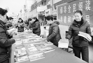 12月是“全民读书月”。为倡导全民阅读,共建和谐社会,连日来,鹿邑县文化局图书馆以宣传“全民读书月”为主题,举办了优秀馆藏图书展、精品图书阅读推荐及“流动图书馆”下乡等活动。图为该县真源办事处居民、学生在“流动图书馆”前免费借阅图书。晚报记者 侯国防 通讯员 蒋保庆 摄