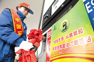 12月15日,一名加油站工作人员在为汽车加注国Ⅲ乙醇汽油。