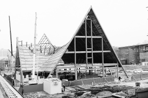 12月19日拍摄的建设中的上海世博会加拿大国家馆(右)和马来西亚国家馆(下)。
