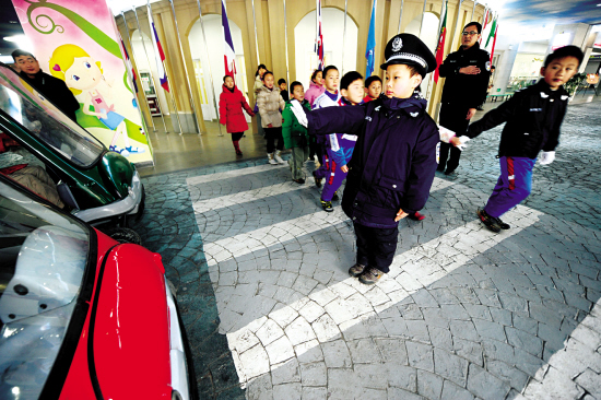 12月20日,“小警察”在“路口”指挥交通。 当日,在南京市公安局雨花台分局的警营开放日活动中,民警带领辖区学校的孩子们来到东方娃娃动漫大世界,借助这里的模拟实景,帮助孩子们了解警察工作,从小培养交通法规意识。 新华社发