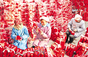 1月5日,山东省沂源县南麻镇东鱼台村的农家妇女在加工工艺鞋垫。