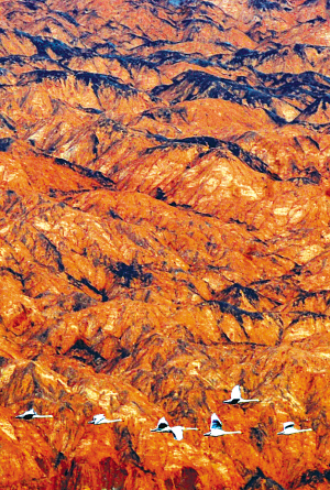 1月9日,一群天鹅在黄河上游湿地的丹霞地貌区飞翔。