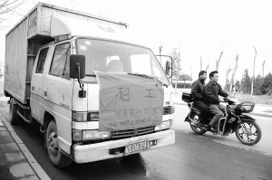 昨天,在市区滨河路上,一位车主将一张招工广告贴在自己的汽车上。新年过后,不少用人单位空闲了很多岗位,急得一些老板想尽各种办法“招兵买马”。晚报记者 朱海龙 摄