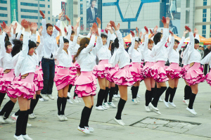 昨日,由市妇联主办、市体育局等单位承办的纪念“三八”妇女节百年大型群众文艺演出在五一广场举行,精彩的表演赢得了观众的阵阵掌声。这是演员们在表演舞蹈《相亲相爱》。(相关报道详见03版)晚报记者 朱海龙 摄