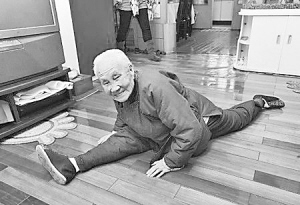 3月9日,在山西省长治市城区蔡家巷社区,一位93岁的老太竟能轻松地劈叉,令人称奇。今年93岁的郭连枝老人,生活很有规律,每晚8时就寝,早晨6时起床,到户外运动半小时,每日三餐定时定量,吃得不多,不挑食,喜食粗粮和甜食。如今,老人儿孙满堂,其乐融融。楚天 摄