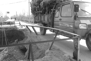 昨日上午9时,记者赶到现场,看到一辆农用车正小心谨慎地从桥上通过(如图)。“像过独木桥一样。”过桥后农用车司机才松了一口气。