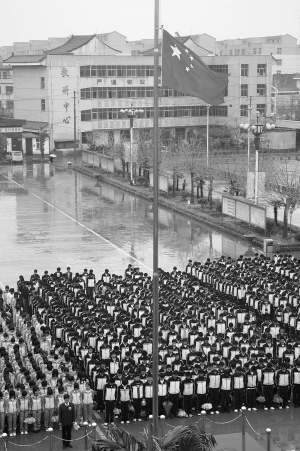 昨日,淮阳中学全体学生在雨中哀悼玉树地震遇难同胞。晚报记者 杜欣 摄