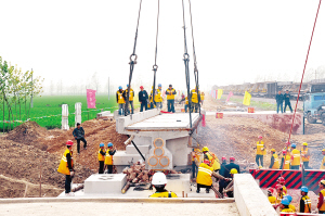 本报讯 4月26日,在商水谭庄,随着漯阜铁路新沟中桥架梁仪式的隆重举行,漯阜铁路复线电气化改造工程桥梁铺架正式拉开序幕,这标志着漯阜铁路复线电气化建设进入了一个新阶段。