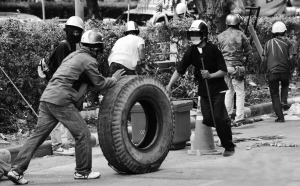 宽斋下令手下冲破检查站,引起双方冲突。其间,士兵向示威者发射橡皮子弹和催泪瓦斯,示威者则以土制“竹火箭”还击。《民族报》说,一派支持现任政府的民间团体加入冲突,与“红衫军”对抗。
