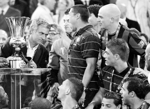 本报综合消息 凭借米利托的精彩长途奔袭进球,国际米兰昨天在意大利杯决赛以1比0小胜罗马,托蒂踢人被红牌罚下,罗马输球又输人。在争取成为欧冠、意甲和意大利杯“三冠王”的进程中,国米迈出第一步。