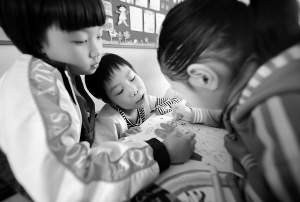 上图:同学们在美术课上和婷婷(中)同画一幅画