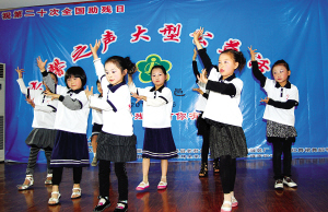 5月16日上午,鹿邑县聋儿康复中心的小朋友在表演节目。当天是全国助残日,鹿邑县一些企业向聋哑儿童捐赠了学习用品、衣服、太阳能等,还共同与聋哑儿童演出文艺节目,在全社会倡导“关爱残疾人,共建和谐社会”的新风尚。