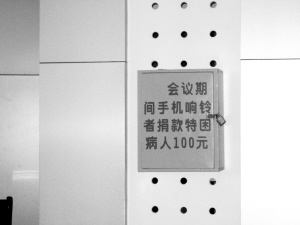 开会时手机乱响,恐怕是每一个参会人员最讨厌的事。5月17日,记者在郸城县某医院采访时发现,悬挂在会议室内的一块“禁鸣”规定非常醒目,虽然是硬性规定,但罚款条文却非常有人情味儿。如果谁的手机在会议期间发出声音,就要向特困患者捐款100元。图中就是这个很有人情味儿的“罚款箱”。晚报记者 徐松 摄