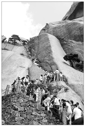 我们随着游人开始上山了,登山的路是用石头砌成的一层层台阶,因为有人常年登攀,棱角已磨得光滑。我们顺着石阶盘旋而上。刚开始我兴致很高,浑身是劲,在导游的引导下,我看到了许多奇峰怪石,那些巨石有的像龟兔赛跑,有的像一休打坐,还有的像八戒酣睡……看起来栩栩如生。