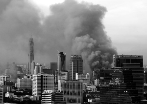部分“红衫军”示威者对其领导人停止集会的决定不满,仍誓言继续斗争。示威者在曼谷多处继续与军队冲突,枪声、爆炸声不时响起。示威者纵火焚烧供电所、世贸中心商场等地,并劫持公共汽车,迫使曼谷所有公交线路停运。示威者还在多处地点焚烧轮胎,曼谷上空黑烟滚滚。同一天,在“红衫军”势力雄厚的西北部地区,乌隆和孔敬市政厅遭纵火。