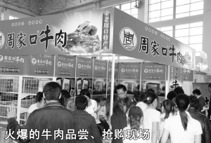 周家口牛肉两个标准展位,以热烈奔放的中国红为基本色调,以“风味远古、品质经典”为牛肉产品品质的制作理念,通过牛肉的内质和外形,用逼真清晰诱人的图片吸引了与会消费者的眼球,环保型牛皮纸包装的周家口牌无坛腌硝牛肉、牛腱、鸡汁灰培豆腐等近二十多个品种摆放整齐、错落有致,整个展厅布置得小巧玲珑、精致典雅、古朴隽美,品味尊贵中饱含丰厚的文化底蕴!展销期间,来自河北、山西、山东、江苏、广东及河南等地的客商被周家口牛肉的优良品质、古朴素雅的包装和大胜靠德的经营理念所吸引,客商们购置周家口牛肉样品,签约经销合同30多份,价值近3000万元。现场开展了牛肉品尝活动,与会的消费者一次次把周家口牛肉展厅围得水泄不通,他们品尝后都说周家口牛肉好吃。尤其是同行业中周家口首先独家开发的鸡汁灰培豆腐,作为老周口特产,更是得到广大消费者的青睐,周家口鸡汁灰培豆腐以其筋道的口感和特有的草灰香味成为展会上一道亮丽的风景。另外,周家口系列产品的环保型、素雅古丽的外包装更是亲近人类和自然!不到3天的时间,周家口牛肉等产品在现场就零售近5万元,带去的样品第一天销售完外,第二天再次紧急运去200件牛肉、鸡汁灰培豆腐,撤展时又被抢购一空!