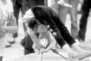 “好了,好了!孩子,快下来吧!阿姨给你10块钱,快下来吧。”一位40岁左右的妇女眼含热泪,投钱给正在表演的孩子。(东方)
