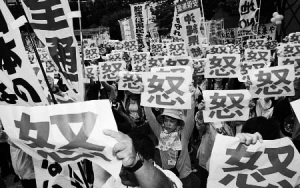 大批民众当天上午聚集在冲绳县政府大楼前,抗议普天间基地依旧“县内搬迁”。许多抗议者高举黄底红字的“怒”字标语牌(右图一)。