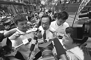 来自境内外100多家媒体的200多名记者将郭台铭层层包围,场面拥挤不堪。郭台铭在几位贴身保镖的护卫下,被裹挟在密不透风的人墙中,大汗淋漓。