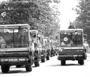 5月31日上午,众多收割机手开着收割机排着长长的队伍从商水县备战路上驶过。据机手刘师傅介绍,他们来自鄢陵,这次组团南下收割的机器多达数百辆。他们将从驻马店开始收割,一路收割到山东,然后再组团返乡。