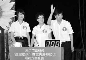 本报讯 昨日下午,从市区中州路上的周口电视台演艺厅里,不时传出抢答声和阵阵掌声。市直机关单位《廉政准则》知识竞赛正在这里激烈进行。为落实中共中央、省委、市委有关通知精神,引导各部门各单位学习贯彻好《中国共产党党员领导干部廉洁从政若干准则》(以下简称《廉政准则》),市直机关工委组织我市各单位特举办了本次《廉政准则》知识竞赛。