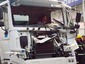 当日6时许,记者赶到现场发现,一辆“中国重汽”大型货车停在路中央,车头已严重变形,挡风玻璃碎片散落一地。司机虽被困在变形的驾驶室内,但他一直神智清醒地配合消防官兵开展救援。
