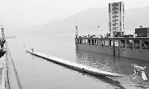 6月5日,工人将巨型龙舟从船坞上拖入江中(下图)。当日,一艘长62米的钢制龙舟在屈原故里湖北省秭归县正式下水,以纪念62岁时投江自尽的伟大诗人屈原。这艘龙舟宽2.4米,型深0.6米,设计吃水0.4米,可容纳120人同时乘划。 新华社发
