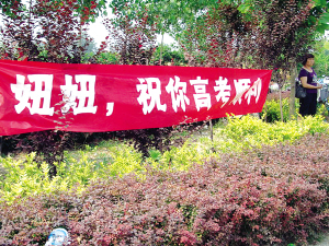 “爸、妈,你们都回去吧,你们守在这儿,我会紧张的。”临上考场前,考生董四洁一边催促父母回家,一边发出爽朗的笑声。
